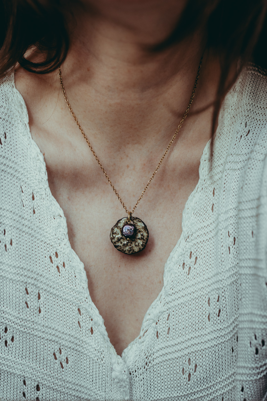 Naszyjnik z ręcznie formowanej, szkliwionej gliny wypalonej w piecu ceramicznym z dodatkiem mosiądzu.